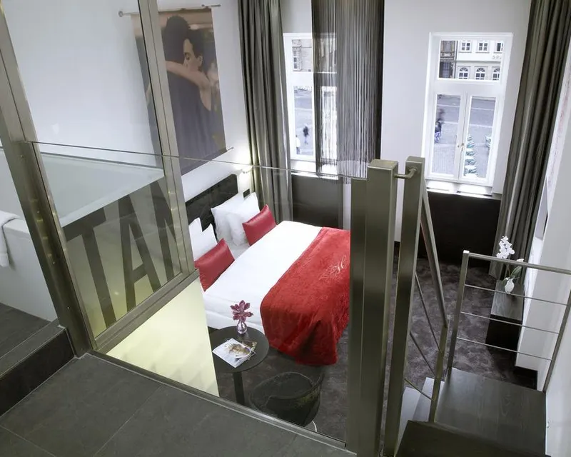 The Junior Suites are furnished with a king-sized bed with a mattress measuring 1.80 x 2.00 m. The Junior Suites, which are approx. 35 m² in size, look out over the historical market square. They feature a modern colour combination of shades of black and white with red accents and a modern interior. A stairway leads to the gallery, where – separated only by a wall of glass – you’ll find the bathroom, a uniquely modern design with two rain showers and a separate bathtub.