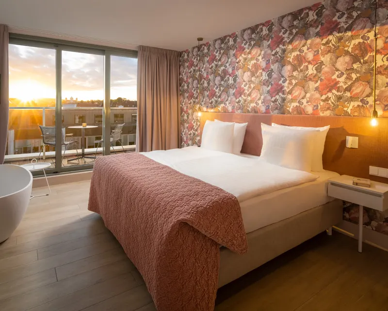 Our Suites have a king bed with a mattress of 1.80 x 2.00 or 2.10 m in size. Both rooms, approx. 46 square meters in size, have a spacious balcony with a wonderful view over the roofs of Hildesheim. The rooms are located with a view of the entrance area. The suites are characterized by a different color scheme and are individually and modern designed. The bathrooms are equipped with a walk-in double shower and a separate free-standing bathtub and are integrated into the sleeping area. The toilet area is attached separately. The living area has a spacious sofa seating area.
