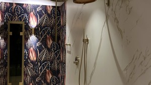 A mixed Finnish sauna, an infrared sauna with two benches, hot and cold water showers and a heated bench with a basin for alternating foot baths.