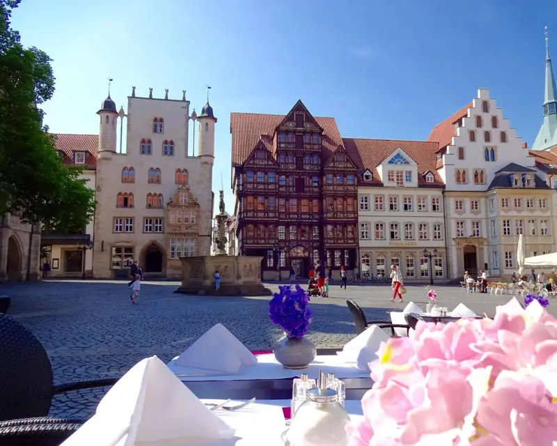 Die Terrasse des Restaurants und der Bar sind bestens gelegen - auf dem historischen Marktplatz umgeben von mittelalterlichen Fachwerkhäusern und Steinbauten.
