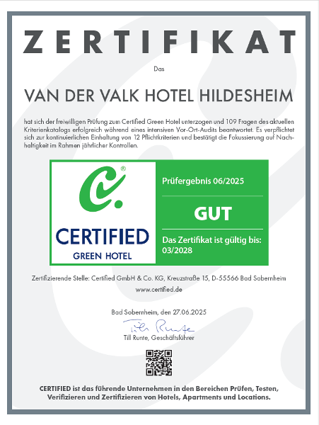 | Das Zertifikat Certified Green Hotel hat das Van der Valk Hotel Hildesheim seit März 2014 erworben. Ausgezeichnet werden Geschäftsreise-Hotels vom VDR - Verband Deutsches Reisemanagement e.V. Die aktuellen Prüfkriterien für diese Zertifizierung können Sie einsehen. |