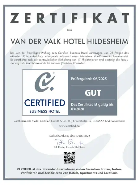 Das Zertifikat Certified Business Hotel hat das Van der Valk Hotel Hildesheim seit März 2013 erworben.