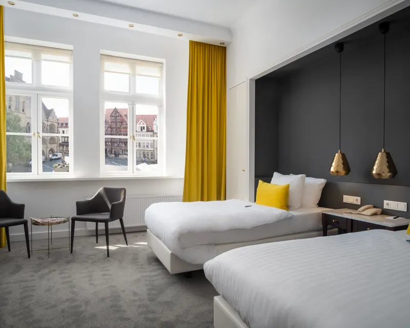 Die Zimmer zeichnen sich durch zwei separat stehende Einzelbetten aus. Die ca. 30 qm großen Zimmer blicken auf den historischen Marktplatz. Ein aktualisiertes Design mit hellen Farbtönen sowie eine moderne Raumgestaltung zeichnen diese Zimmer aus. Das besondere an diesen Zimmern ist das Flamingo-Design an einer Zimmerwand. Die Badezimmer sind alle mit einer Regendusche ausgestattet.